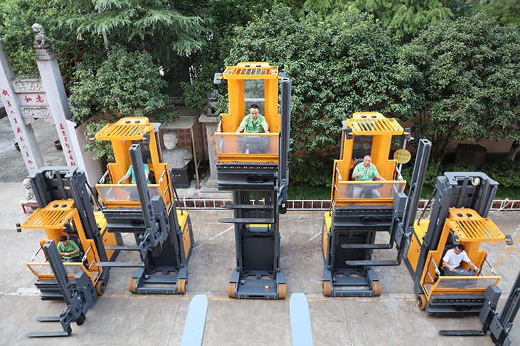 Conventional material handling equipment asks for at least 3 meters’ aisle width, while XILIN’s VNA truck needs only 1.7 meters to achieve flexible work. Its lifting height is up to 10 meters. The fork is not only able to move from left to right, but is also capable of rotate 180°. XILIN’s VNA truck is designed to travel all around, which is a remarkable upgrade compared with previous models. The function that the operator lifts up with the fork makes material handling more efficient in a great extent. At the same time, it took the lead in implementing national standards to manage and record running speed, lifting height, reversing status, operator authority, blind area video, etc. The two technologies have fulfilled the technical gap of the industry, which have been listed on the municipal key projects list Besides, the VNA truck can also be customized in use according to different needs.
